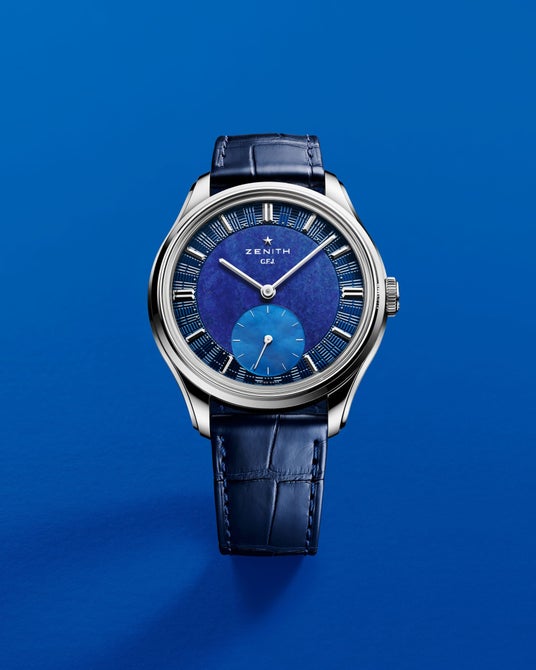 サファイアガラスの内側には、「G.F.J.」があしらわれたブルー文字盤が配されています。ゼニスのシグネチャーカラーであるブルーとスターロゴは、空と深く結びついたゼニスというブランドと、精度への飽くなき探求心のシンボルです。3つのパートで構成されたデザインが魅惑的な深みを生み出し、緻密に作り上げられたディテールが洗練さを醸し出します。