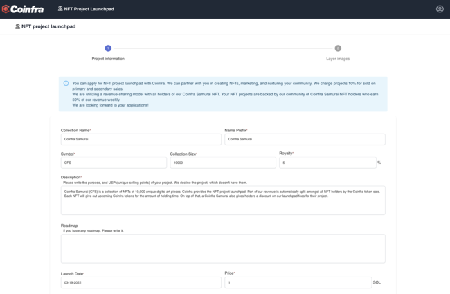 共同購入ビジネスを運営している過程で、NFTに共同購入の新しい可能性を見出し、2022年初にSolanaブロックチェーン上でのNFTプロジェクトの立ち上げツールCoinfraを海外市場向けにリリースいたしました。