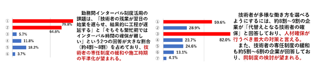 ▲ 左:「勤務間インターバル制度」活用の課題は何か、右:技術者が育児休業(特に男性)や時短勤務、フレックスタイム制度などの多様な働き方を選べるようにするため、どのような対応が必要か