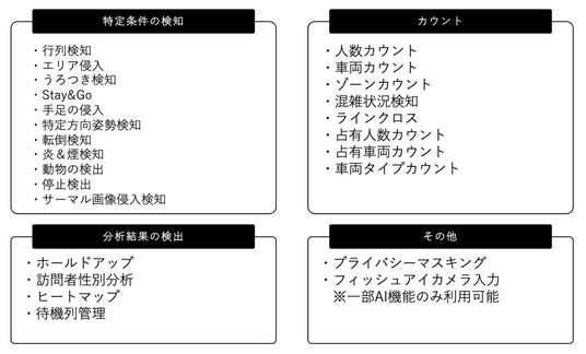 転倒・侵入・混雑状況・駐車場管理等30 以上の項目(※1)を検知可能