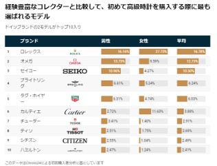 男性の16.2%、女性の27.7%が初めての時計にロレックスを購入しています。男性購入者の場合、オメガが13.7%、セイコーが11%と続き、女性購入者の場合は、カルティエが11.5%で2位に、 オメガが9.6%で3位にランクインしています。
