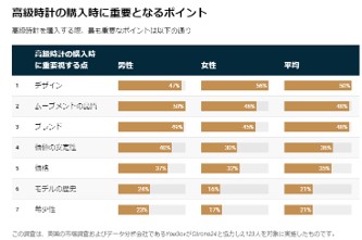 ■高級時計を購入する際に重要視するポイントは「デザイン」が1位、男女間のわずかな差もみられる