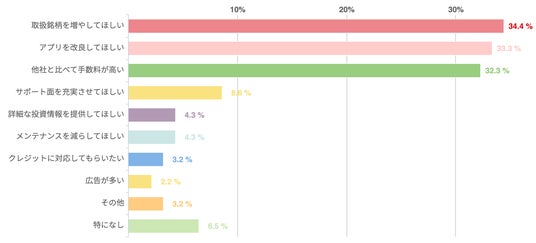 アンケートによれば、「取扱銘柄を増やしてほしい(34.4%)」、「アプリを改良してほしい(33.3%)」、「手数料をさらに安くしてほしい(32.3%)」といった様々な要望が寄せられた。