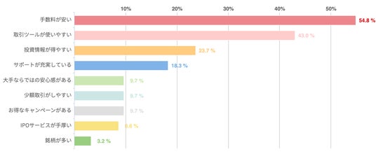 アンケートによれば、顧客が評価している主な点は「手数料の安さ(54.8%)」と「取引ツールの使いやすさ(43.0%)」であった。