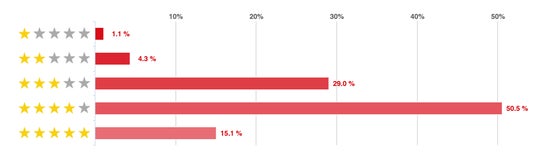 高評価の4点と5点をつけた回答者の割合が全体の65.1%であり、低評価の1点と2点をつけたユーザーが合わせて5.4%に抑えられていることから、松井証券のサービス品質の高さが伺える。