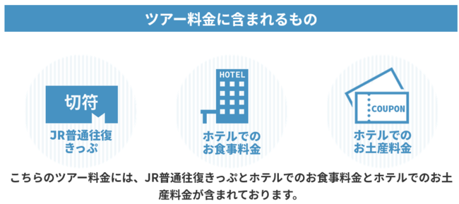 こちらのツアー料金には、JR普通往復きっぷとホテルでのお食事料金とホテルでの お土産料金が含まれております。