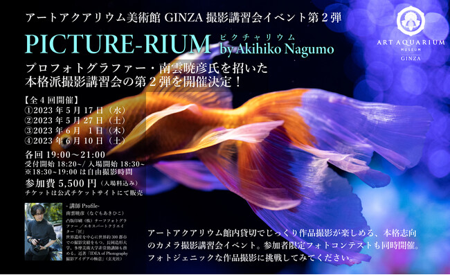 フォトグラファーとして活躍する南雲暁彦氏を講師にお招きした撮影講習会、PICTURE-RIUM。本イベントでは、貸切の館内にて巧妙な撮影技術を学びながらアートアクアリウムの幻想的な世界を撮影を通してお楽しみいただけます。