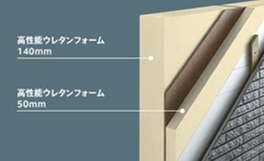 一般的なグラスウールの約2倍の断熱性を発揮する「高性能ウレタンフォーム」を天井・床・外壁の全ての構造パネルに採用。壁には、外側に50mm、内側に140mmとダブルで使用しています。