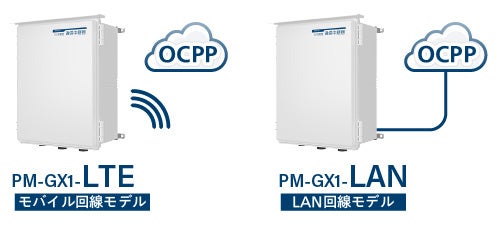 「見せない普通充電器」によるOCPPサーバー連携は、新発売の専用オプション「通信中継器 GX1」を併設することで可能になります。「通信中継器GX1」は、最大10台の見せない普通充電器とワイヤレス通信で連携し、インターネット回線経由でOCPPサーバーと接続する機能を有しています。インターネット回線への接続方法は、「LTEモバイル通信モデル」と「有線LAN通信モデル」の2種類から選ぶことができます。