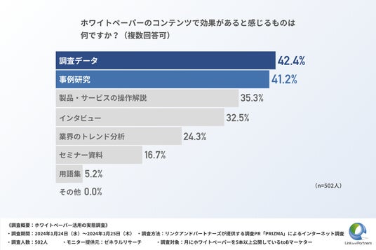 ・ホワイトペーパーのコンテンツで最も効果があるのは、「調査データ」で42.4%と判明