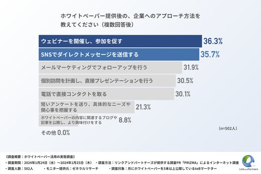 ホワイトペーパー提供後の、企業へのアプローチ方法は「ウェビナーを開催し、参加を促す」が36.3%を占める結果に