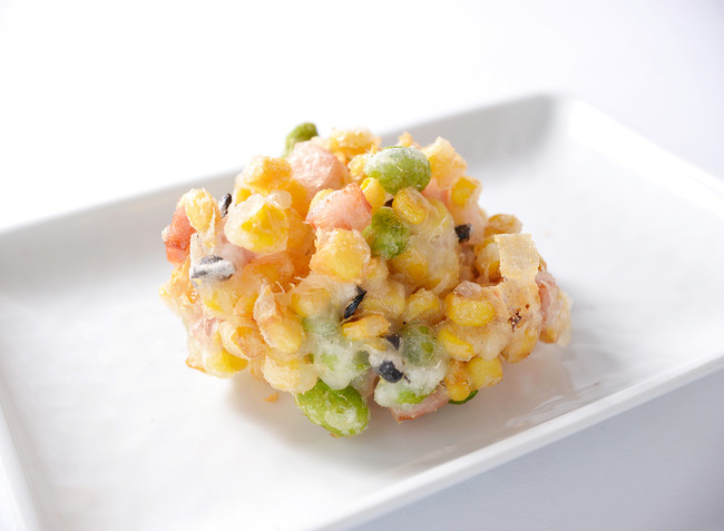 10そばこだわりのかき揚げには、夏のおいしさが楽しめる「とうもろこしと枝豆のピザ風かき揚げ」が登場。