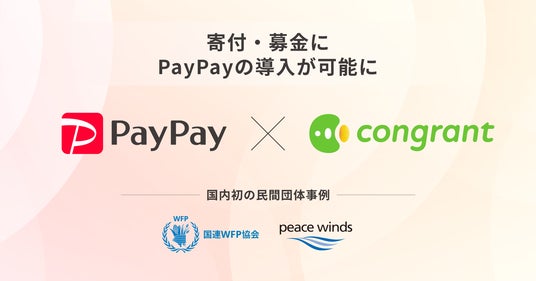 ソーシャルセクターと企業向けに「寄付DXシステム」を提供するコングラント株式会社(本社:大阪市西区、代表取締役:佐藤正隆、以下「コングラント」)は、PayPay株式会社(本社:東京都港区、代表取締役社長 執行役員CEO:中山 一郎、以下「PayPay」)の開発パートナーとして、寄付DXシステム「コングラント」の寄付・募金の支払い方法に「PayPay」を追加し、国連WFP協会、ピースウィンズ・ジャパンの2団体に提供を開始しました。