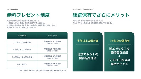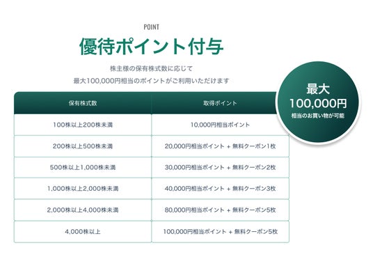 - 半年以上/1年以上の継続保有株主様への追加優待およびポイント付与