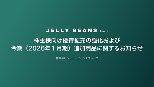 株式会社ジェリービーンズグループでは、昨期(2025年1月期)より導入した株主優待制度(ダブル優待・中長期保有特典・株主様向け常設サイト)につき、多くの株主様から高いご支持をいただいており、制度開始以降、利用頻度の向上や継続保有期間の長期化など、株主エンゲージメントの深化という形で着実な成果が表れております。
