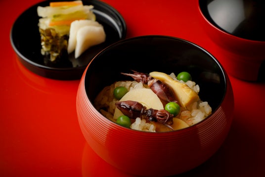 鰹・鮪・昆布を丁寧に引いた合わせ出汁で、ふっくらと炊き上げた香り豊かな筍ごはん。粒立ちのよいお米が持つ旨みがやさしく広がり、春の気配をそっと運んでくれます。炊きあがった筍ごはんに、うすい豆と蛍烏賊を合わせることで、季節の彩りと滋味が一層引き立ち、心ほどけるような春の御飯に仕立てました。