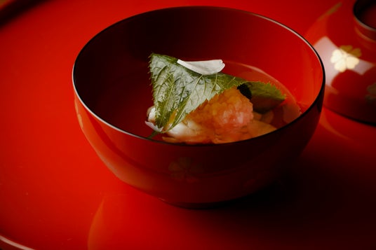 昆布出汁で丁寧に下ごしらえした鮎魚女に、桜餅と桜の葉を添えた、春薫る清まし汁。五年熟成の昆布と、鮪の本枯節から引いた一番出汁は、澄んだ旨みが静かに広がり、上品な余韻を残します。春の恵みであるウドを桜の花びらに見立ててあしらい、器の中にひらりと春が舞い降りたような、目にも華やぐ一椀に仕立てました。