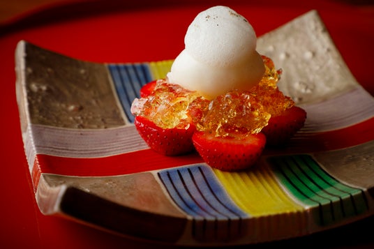 旬の苺をたっぷりと味わう、春ならではのフレッシュデザート。みずみずしい苺の上に、梅酒のゼリー、ソルベ、そして軽やかなフォームを重ね、異なるテクスチャーが織りなすハーモニーが、爽やかな春の余韻をそっと運びます。甘酸っぱさと香りが重なり合い、季節の息吹を感じさせる、心華やぐデザートがコースを爽やかに締めくくります。