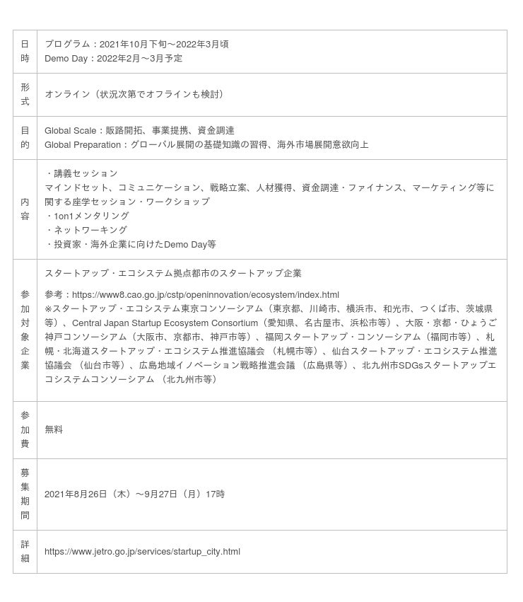 ジェトロは、本年10月下旬から来年3月にかけて、内閣府「スタートアップ・エコシステム形成推進事業」拠点都市8カ所のスタートアップを対象としたアクセラレーションプログラムをオンラインで実施します。本プログラムは、世界トップレベルのアクセラレーターとジェトロが提携し、日本のスタートアップのグローバル展開を後押しするとともに、日本の地方エコシステムをより一層活性化させることを目的としています。