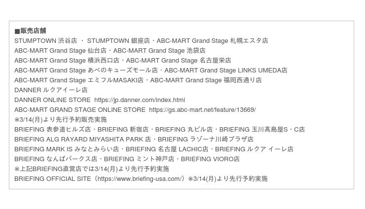 DANNER×BRIEFINGコラボレーションアイテムは2022年3月14日(月)より、ABC-MART GRAND STAGE ONLINE STORE、BRIEFING OFFICIAL SITE、BRIEFING一部直営店にて先行予約を開始、3月25日(金)より両社にて同時一般発売致します。