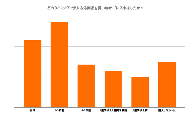 現地の消費者は、メガキャンペーンの当日よりも前に商品を探し始め、購入の意思決定を行う可能性が非常に高いと予測しています。調査結果では、64%の消費者がメガキャンペーンの前に商品をカートに入れ、その中の50%以上の消費者はセールの1~3日前にカートに入れていることがわかりました。