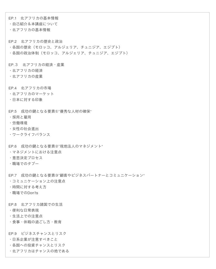 ▶ 国別駐在員研修 ビジネス解説版 北アフリカ編 講座構成