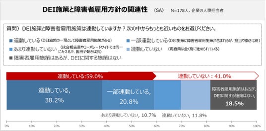 調査では、DEI施策と障害者雇用施策の関係性についても尋ねた。その結果、4割(38.2%)がDEIに関する施策と障害者雇用施策が「連動している」と回答し、「一部連動している」(20.8%)とあわせて、6割の企業が、両者が連動していると回答した。一方で、「障害者雇用施策はあるが、DEI施策はない」という企業は(18.5%)に達していた。