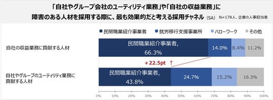 この結果から、企業は高度なスキルや業務遂行能力を持つ障害のある人材の採用には、民間職業紹介事業者が最も効果的なチャネルと考えられていることがわかる。また、ユーティリティ業務においても、柔軟な対応と専門的な支援が求められるため、同様に民間職業紹介事業者の利用が進んでいることが示唆される。