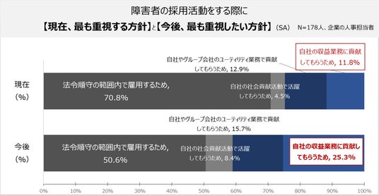 - 障害者の雇用方針「現在と今後」:現在の障害者雇用の方針として、7割(70.8%)の企業が「法令順守(法定雇用率の達成)」に重点を置く。一方、将来的には4社に1社(25.3%)が「自社の収益業務に貢献する(戦力化)」ことに方針を転換。