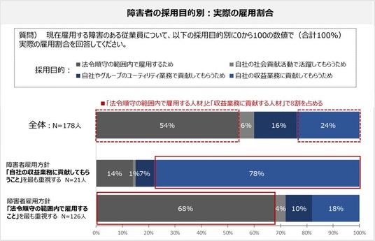 - 障害者の採用目的別:実際の雇用割合:全体では、「法令順守の範囲内で雇用する人材」と「収益業務に貢献する人材」で8割を占めており、「ユーティリティ業務に貢献する人材」と「社会活動で活躍する人材」の雇用割合は2割にとどまった。これらの目的は、企業の直接的な利益として位置づけられにくいため、その雇用割合が相対的に低い。
