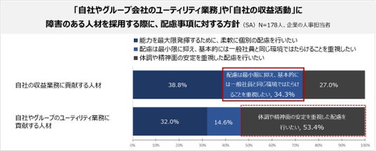 - 採用目的別における「求める資質や職能・配慮事項の方針」:「自社の収益業務に貢献する人材」には、職務遂行能力やスキルが求められ、3割(34.3%)が「配慮は最小限で、一般社員と同じ環境ではたらけること」を重視。「自社やグループのユーティリティ業務に貢献する人材」には、体調や勤怠の安定・周囲との良好な関係性を重視し、半数以上(53.4%)が「体調や精神面の安定を重視した配慮」を行うと回答。
