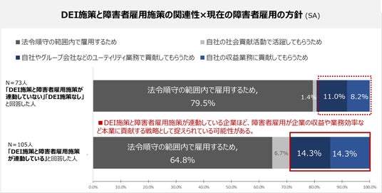 さらに、「DEI施策と障害者雇用施策が連動している」企業と、「DEI施策と障害者雇用施策が連動していない・DEI施策がない」企業における、現在の障害者雇用の方針を分析した。