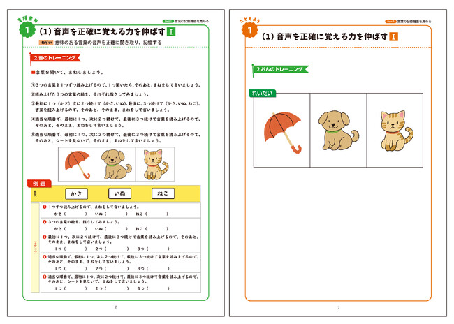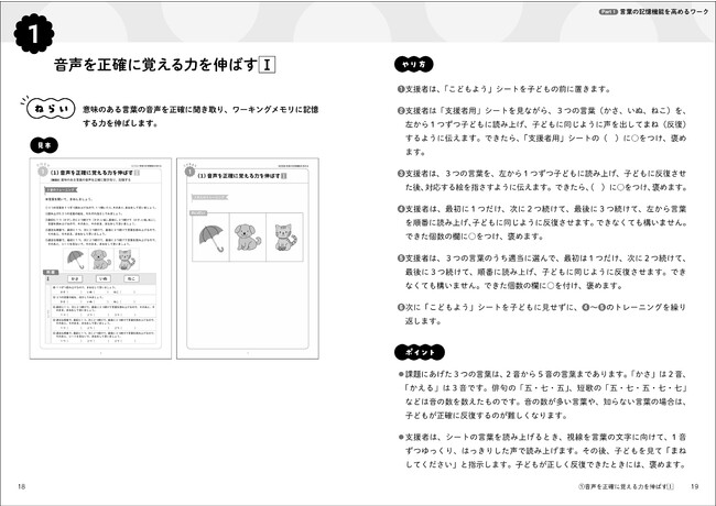 「Part1. 言葉の記憶機能を高めるワーク」には、「音声を正確に覚える力」「文を読む力」など言葉の音声情報の知識獲得をうながすトレーニングを掲載。