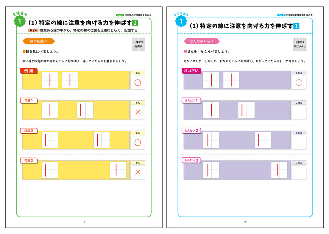 ワークは言語編と視空間編に分かれ、就学後の学習に必要な力を網羅的に鍛えられます!