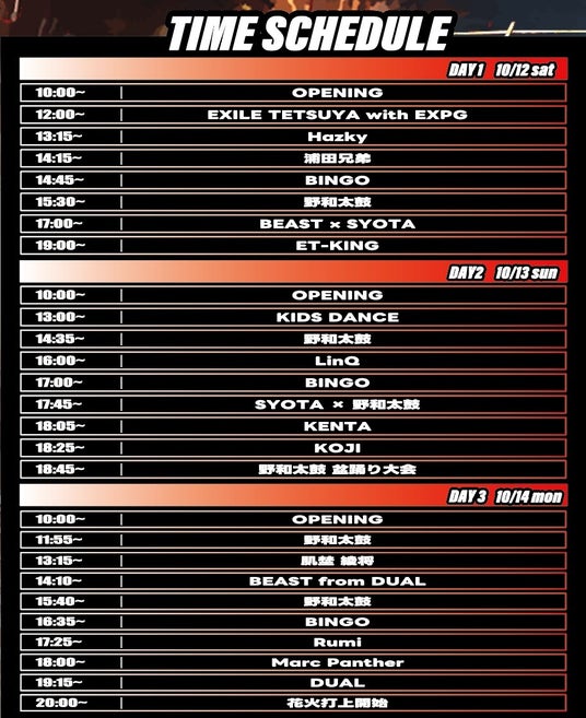 10:00~20:00 ※14日のみ10:00~21:00 ※花火は10月14日(月・祝)20:00~予定
