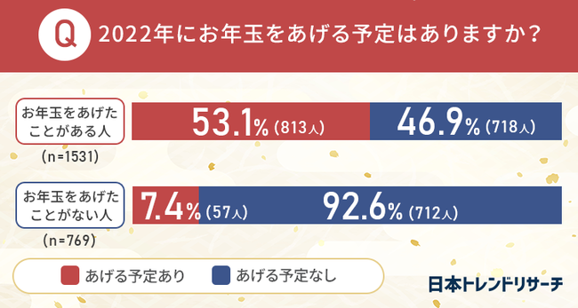 これまでにお年玉をあげたことが「ある」方の53.1%が、2022年もお年玉を「あげる予定がある(あげた)」と回答しています。
