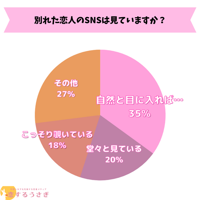 恋するうさぎ編集部が行った「別れた恋人のSNSを見ているか」のアンケートによると1位:自然と目に入れば…が35%、 2位:堂々と見ているが20%、3位:こっそり覗いているが18%という結果になりました。