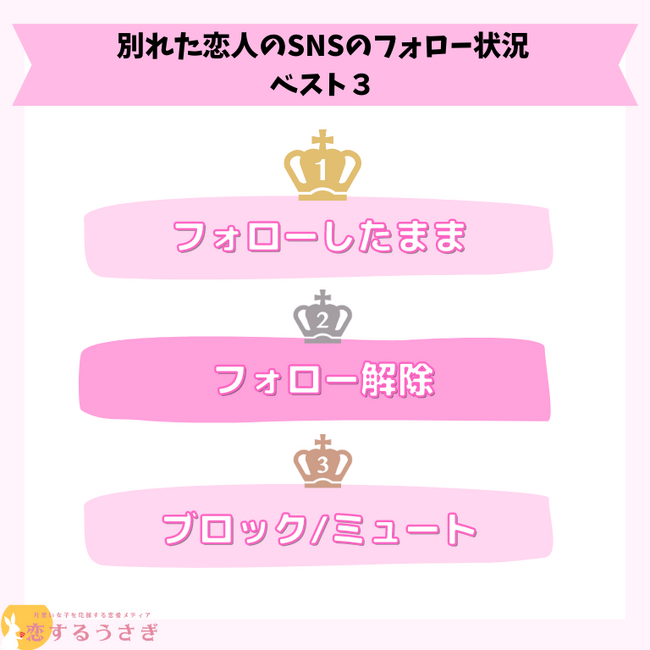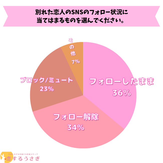 恋するうさぎ編集部が行った「別れた恋人のSNSをフォローしているか」のアンケートによると1位:フォローしたままが36%、 2位:フォロー解除が34%、3位:ブロック/ミュートが23%という結果になりました。