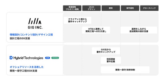 当社は2022年3月、スタートアップを中心に開発と資金調達を支援する「Hybrid Technologies Capital」プロジェクトを開始し、同プロジェクトの第1弾支援先として、GIG社を支援いたしました。この支援を通じて、当初よりマーケティングやUX/UIデザイン等のプロダクト戦略のコンサルティングを得意としていたGIG社と、開発、実装工程に強みを持つ当社との提携を通じて、顧客のプロダクト戦略から実装、運用を支援する協業体制を構築しておりました。