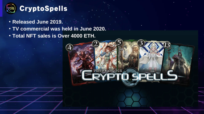 NFTサービスの開発を行うCryptoGames社は、ウォレット・イーサリアムなしで遊べるブロックチェーンゲーム『クリプトスペルズ』を2019年6月25日に正式リリースしています。クラウドセールの売上は900ETHを突破し、当時日本最高記録となりました。2020年6月には初の地上波テレビCMも実施しました。