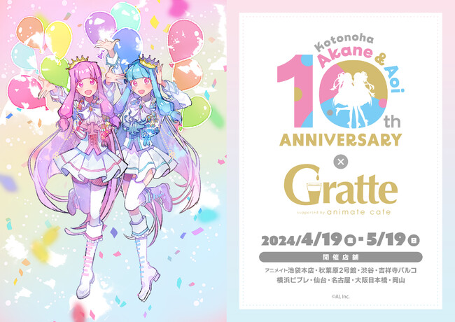 高品質音声合成エンジンAITalk(R)を開発・提供する株式会社エーアイ(本社:東京都文京区、代表取締役社長:廣飯伸一、証券コード:4388、以下:エーアイ)は、自社が開発するA.I.VOICE他、音声合成ソフト等で活躍中の双子の姉妹キャラクター「琴葉 茜・葵」の10周年を記念したコラボレーションカフェを、株式会社アニメイト(本社:東京都板橋区、代表取締役:藤樹潤、以下:アニメイト)が展開するアニメイトカフェグラッテにて2024年4月19日より実施することをお知らせいたします。
