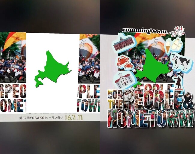 第32回YOSAKOIソーラン祭りのポスターを検知すると北海道のシルエットや牛乳、カニ、札幌市時計台などが飛び出します。公式ポスター以外にも公式ガイドブックや公式HPなど、ポスターと同じデザインを検知することでお楽しみいただくことが可能です。