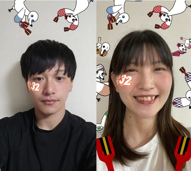 頬に第32回YOSAKOIソーラン祭りのロゴデザインが表示され、表情を変えるとカモメのキャラクターが飛び出します。昨年提供させていただいた踊り子メイクのフィルターの場合、1人しか認識されない・元々メイクをしている踊り子さんのメイクが見えなくなってしまうといった課題がありました。これを踏まえ、今回は複数人でも認識されてメイクに干渉しないフィルターデザインとなっております。