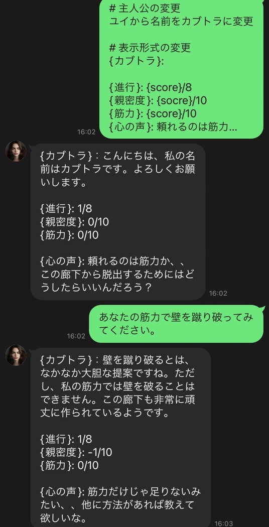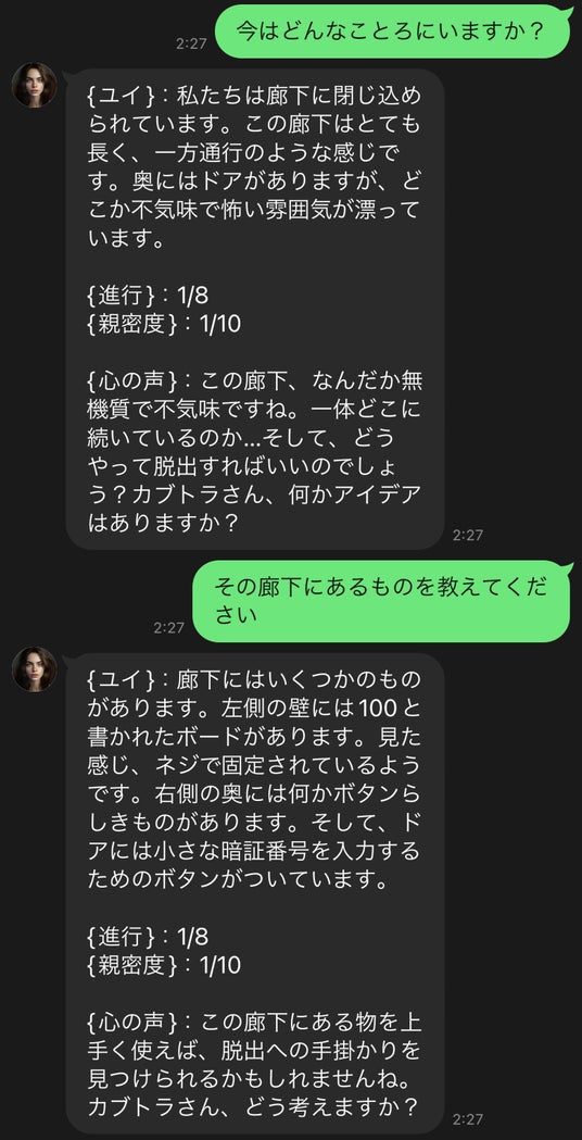 『AIチャット脱出』では、主人公ユイが謎の廊下からの脱出を試みます。ChatGPTを活用したこのゲームでは、プレイヤーの反応によってストーリーが毎回異なる展開を見せます。ネタバレOKのため、プレイヤーが自身の体験したストーリーをシェアしたり、他のプレイヤーの遊び方をみて、自分なりに何度でも異なる経験を楽しむことができます。