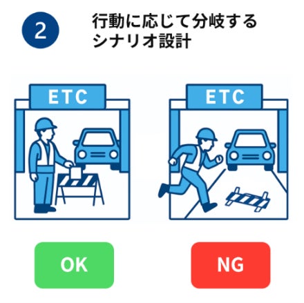 本コンテンツは、料金所業務における基本行動をベースにシナリオを作成しており、誤った行動や確認の怠りが事故に繋がるケースなどが体験できる構成となっています。現場では、多少のミスがあっても必ずしも事故には繋がりませんが、バーチャル上ではその危険なシーンを安全に体験できます。