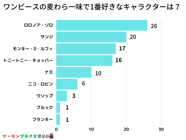 合同会社Makima(https://makima.co.jp/)が運営するゲームセンター情報メディア「ゲーセンプライズまとめ」(https://cocoaorei.work/prize/)は、日本全国の10代以降の男女の方を対象に「ワンピースの麦わら一味で1番好きなキャラクターは?」についてのアンケート調査を実施しました。