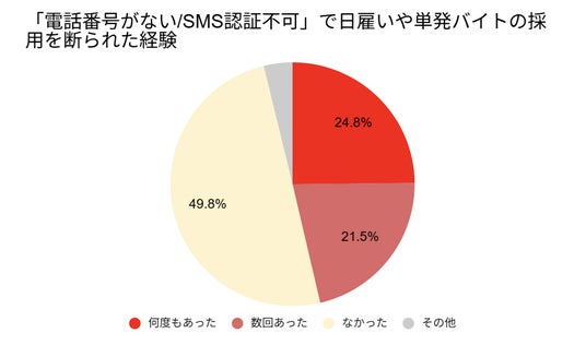 同調査にて、「『電話番号がない』または『SMS認証ができない』という理由で、日雇いや単発バイトなどの応募・採用を断られた経験」について尋ねたところ、「何度もあった」と回答した人が150人、「数回あった」と回答した人が130人に上りました。
