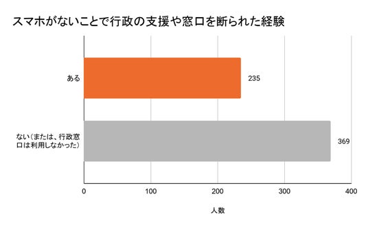同調査では「スマホがないことで、行政の支援や窓口を頼ろうとした際に『電話番号がないから』と予約や相談を断られた経験」について、235人が「ある」と回答しています。
