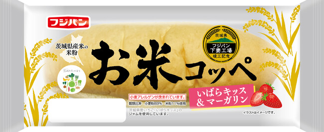 茨城県産米の米粉を使用したコッペパンに茨城県産いちご「いばらキッス」を使用したジャムとマーガリンをサンドしました。茨城県産米粉を11%使用。ほのかな甘みにやわらかでもっちりとした食感が特徴のコッペパンです。※穀類比率 小麦粉89% 米粉11%使用 ※小麦アレルゲンが含まれています