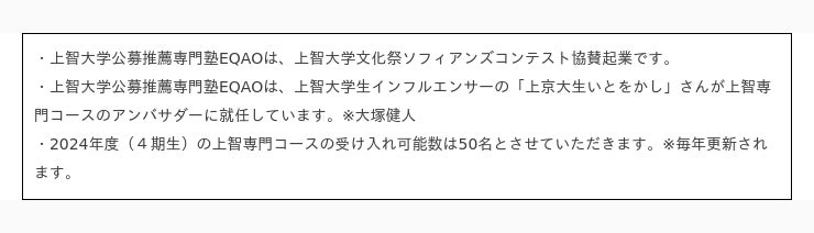 総合型選抜・学校推薦型選抜入試で難関私大を目指すなら「EQAO」合格率は驚異の「94.55%」。総合型選抜入試専門塾EQAOは、青山学院大学・立教大学・國學院大学・同志社大学など数多くの難関私大においえて業界トップクラスの合格率を誇っている塾です。また、上智大学の公募推薦入試対策に強い塾として知られています。実際に、EQAOに在籍する塾生の半数以上が上智志願者となっております。2023年度の上智大学総合グローバル学部の合格者の実に10人に1人がEQAOとなっているほどです。上智大学や青山学院大学、立教大学などの難関私大以外にも数多くの合格実績があり、幅広く総合型選抜入試・学校推薦型選抜入試対策が可能です。【兵庫県 西宮/三宮】周辺で総合型選抜・公募推薦入試専門塾を探している高校生はぜひ、EQAOの無料体験授業に来てください。オンライン対策ももちろん可能です。上記のエリア以外で、相談がある場合も特別対応可能ですので、お気軽にお問合せください。相談の受け入れ開始時期は、2023年2月13日となります。